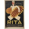Cette affiche originale vintage « Biscotines Union », illustrée par le célèbre Leonetto Cappiello et imprimée par Vercasson à Paris, est un chef-d'œuvre incontournable de la publicité alimentaire du début du XXe siècle. Réalisée en lithographie et mesurant 112 x 153 cm, elle illustre à la perfection le style audacieux et immédiatement reconnaissable de Cappiello, considéré comme le père de l’affiche publicitaire moderne.Dès le premier regard, cette affiche ancienne frappe par sa composition minimaliste et percutante. Sur un fond noir intense, un personnage burlesque aux cheveux rouges flamboyants, affublé d’un béret vert, surgit avec un immense sourire malicieux. Il brandit entre ses mains une biscotte géante, dorée à souhait, qui occupe presque toute la surface centrale de l’image. Ce contraste saisissant entre le fond sombre et les tons éclatants du personnage et du produit renforce l’impact visuel de l’affiche, suivant l’un des principes fondamentaux du style de Cappiello : la simplification graphique au service de la mémorisation immédiate du message.Leonetto Cappiello (1875-1942), d’origine italienne mais actif à Paris, est l’un des affichistes les plus influents de son époque. Il révolutionna le monde de la publicité en privilégiant les formes simples, les couleurs franches et des figures humoristiques ou fantaisistes, capables de captiver le regard en une fraction de seconde. On lui doit des affiches emblématiques comme celles du « Chocolat Klaus » ou du « Campari ». Dans cette création pour les Biscotines Union, il synthétise tout son savoir-faire : efficacité visuelle, humour et mise en avant du produit.La typographie utilisée est volontairement directe et sans détour. Le nom du produit, « BISCOTINES UNION », en jaune vif, surplombe la scène, tandis que la mention « PRODUIT DE SURALIMENTATION » en lettres capitales renforce l’idée d’un aliment fortifiant et nourrissant, particulièrement adapté au contexte d’après-guerre ou aux périodes de privation où l’enrichissement alimentaire était valorisé. L’adresse « 59, Gᵉ Rue, Roubaix » confirme l’ancrage industriel du produit dans le nord de la France, région fortement marquée par son passé textile et ouvrier.Imprimée par l’établissement Vercasson, imprimeur réputé du quartier parisien de Montmartre, cette lithographie bénéficie d’une qualité d’exécution remarquable. Elle a été entoilée de manière professionnelle, assurant sa conservation durable tout en mettant en valeur l’intensité des couleurs originales. Son état très bon (A-) la rend particulièrement désirable pour les collectionneurs, amateurs d’art graphique ou passionnés de publicité ancienne.Affiche originale d’exception par l’un des maîtres du genre, « Biscotines Union » incarne avec humour et puissance visuelle l’âge d’or de l’affiche publicitaire française. Un témoin précieux de la modernité graphique des années 1900-1920, et une pièce de collection idéale pour tout amateur de Cappiello ou de patrimoine visuel.