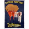 Cette affiche originale vintage « Copertoni Impermeabili - Ettore Moretti », réalisée par l'illustrateur Mauzan et imprimée par l’atelier MAGA, est une lithographie publicitaire saisissante tant par son style graphique affirmé que par la force de son message visuel. Avec ses dimensions imposantes de 143 x 200 cm, cette création incarne l’élégance et la créativité des campagnes publicitaires italiennes du début du XXe siècle.Signée par Achille Mauzan, artiste franco-italien renommé pour son style visuel percutant et son goût du graphisme symbolique, l’affiche repose sur une composition minimaliste et stylisée. On y voit une charrette rouge vif, tirée par une paire de chevaux stylisés en blanc et beige, avançant sur un fond bleu nuit profond. Le véhicule transporte une immense charge protégée par une couverture imperméable orange, gonflée comme une voile sous le vent, évoquant à la fois la légèreté et la solidité du produit vanté.Le contraste des couleurs - rouge, orange, bleu marine - associé à l’épure du dessin donne à la scène une dimension presque abstraite, où le message repose sur la seule efficacité visuelle : les « copertoni impermeabili » (bâches ou protections imperméables) Ettore Moretti assurent un transport à l’abri des intempéries. L’ensemble est renforcé par les longues traces rouges et sombres qui s’étirent sous les roues, suggérant la pluie ou l’effort dans un climat humide.Mauzan (1883-1952) s’est distingué par sa capacité à transformer un produit ordinaire en image frappante, en utilisant souvent l’humour ou la stylisation extrême. Actif entre Paris, Milan et Buenos Aires, il a marqué de son empreinte les débuts de l’affiche moderne en Europe. Cette œuvre témoigne de son style dans sa période italienne, plus graphique et symbolique que ses compositions humoristiques des années précédentes.L’impression a été réalisée par MAGA, une maison d’édition milanaise de renom spécialisée dans les affiches publicitaires grand format, qui travaillait régulièrement avec Mauzan. L’adresse indiquée au bas de l’affiche, « Ettore Moretti, Milano - Foro Bonaparte 12 », confirme l’origine commerciale de la marque dans un quartier prestigieux de la capitale lombarde.L’affiche a bénéficié d’un entoilage professionnel qui garantit sa conservation. Malgré la présence visible de plis anciens et de quelques marques d’usage, compatibles avec son âge, l’état général reste satisfaisant. Ces signes d’usure n'altèrent pas la lisibilité de l’image ni l’impact graphique global de la composition.Par son esthétique affirmée, la force de sa construction visuelle et la signature prestigieuse de Mauzan, cette affiche ancienne constitue un très bel exemple de l’affiche publicitaire italienne moderniste. Un objet à forte valeur décorative et historique, prisé par les collectionneurs passionnés de design graphique et d’art commercial.