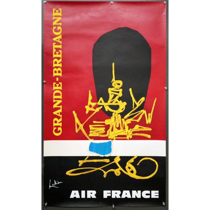 L'affiche fait la promotion de l'un des leaders du transport aérien, Air France, symbolisant la connexion entre la France et la Grande-Bretagne. Les mots "GRANDE-BRETAGNE" sont affichés en lettres jaunes audacieuses sur un fond rouge, évoquant à la fois le dynamisme et l'attrait des voyages aériens.