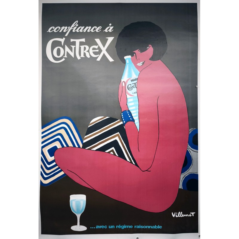 Cette affiche originale "Confiance à Contrex avec un Régime Raisonnable" de Villemot est une pièce unique qui attire immédiatement l’attention. Imprimée par Lalande Courbet, elle promouvoit l’eau minérale Contrex, célèbre pour ses propriétés diététiques et sa pureté. La représentation visuelle de cette affiche permet de découvrir un style artistique iconique caractéristique des années 70, avec une esthétique à la fois graphique et colorée.