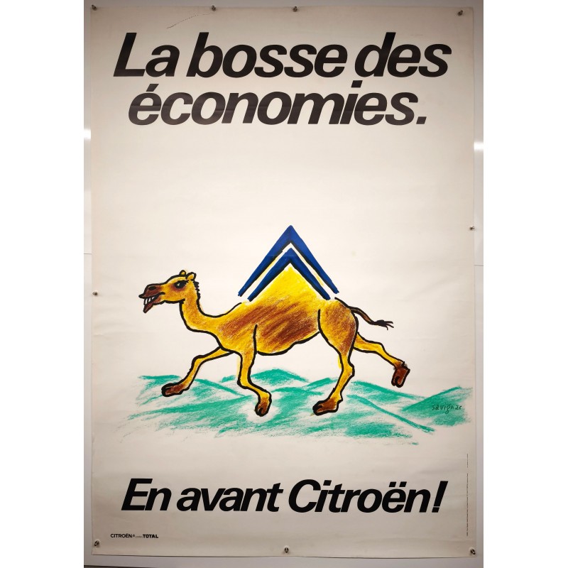 Au cœur de cette affiche, un chameau au ton vibrant est représenté, évoquant l'idée de robustesse et d’économies, en lien avec les valeurs de Citroën. Le slogan, "En avant Citroën!", est placé en bas de l'affiche, en caractères gras et bien lisibles, attirant instantanément l’attention du spectateur. Les lignes nettes et la typographie graphique renforcent l’impact visuel de l'ensemble.
