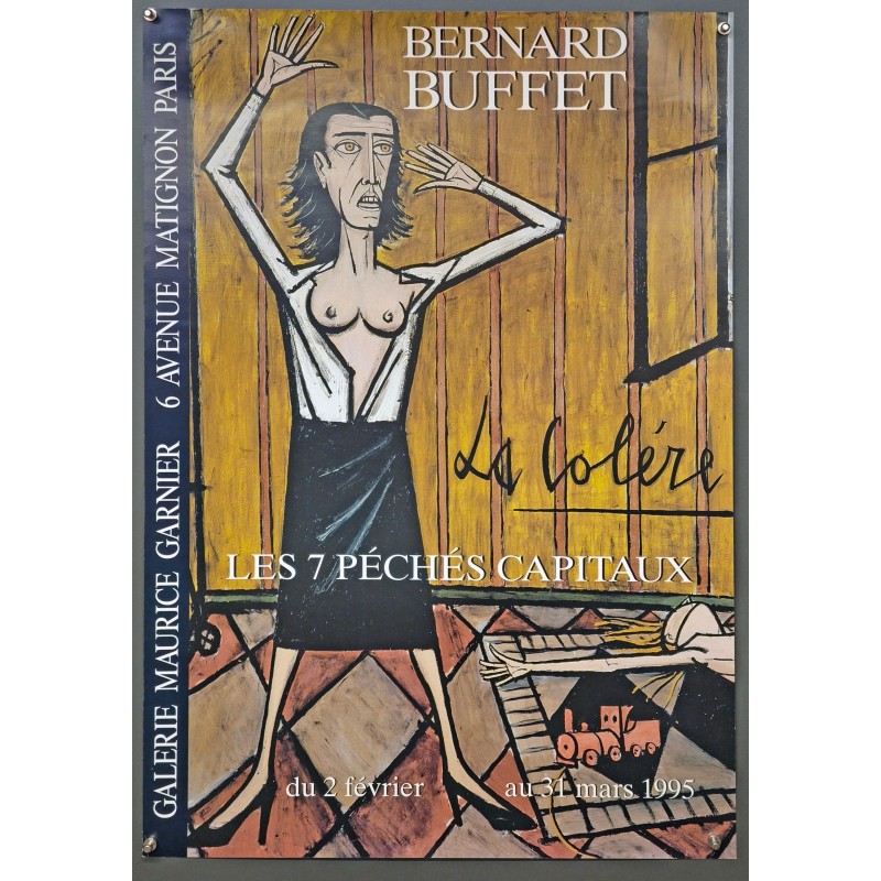 Cette affiche originale Bernard Buffet Galerie Maurice Garnier La Colère Péchés Capitaux de Bernard Buffet en 1995 est une véritable œuvre d’art qui attire le regard par sa forte présence graphique. Réalisée pour promouvoir une exposition d'art au sein de la prestigieuse Galerie Maurice Garnier à Paris, elle met en avant l’une des thématiques clés de l'œuvre de Buffet, à savoir les émotions humaines et les péchés capitaux.