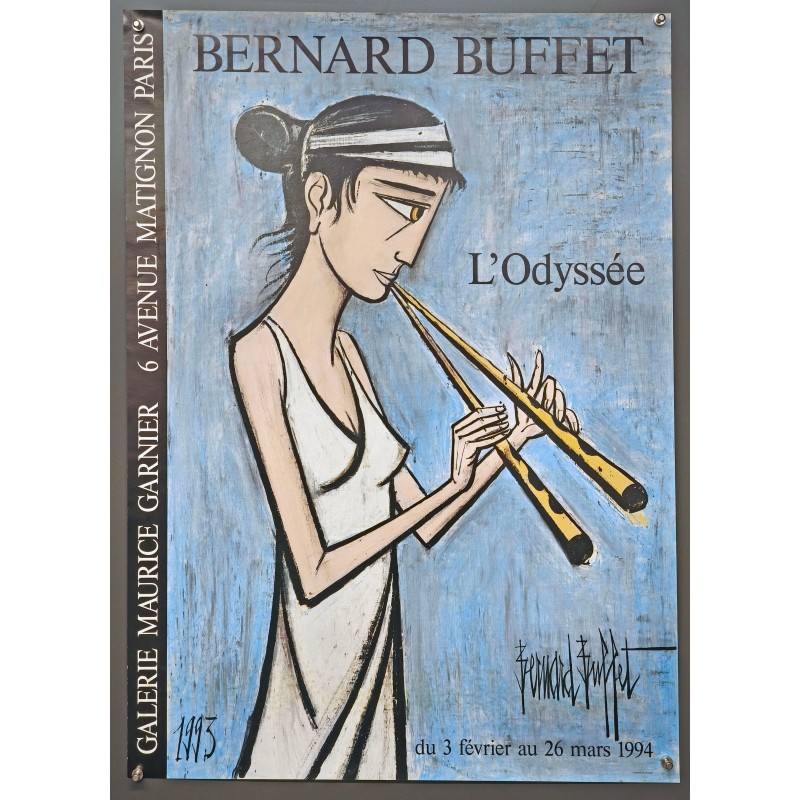 Visuellement, l'affiche présente une figure féminine stylisée, jouant des flûtes. La typographie, avec "BERNARD BUFFET" en lettres majuscules, s'impose avec force dans la partie supérieure, tandis que le titre "L'Odyssée" capte immédiatement l'attention. Les mains délicates de la musicienne et sa silhouette élancée sont des éléments clés qui reflètent l'élégance propre au style de Bernard Buffet.