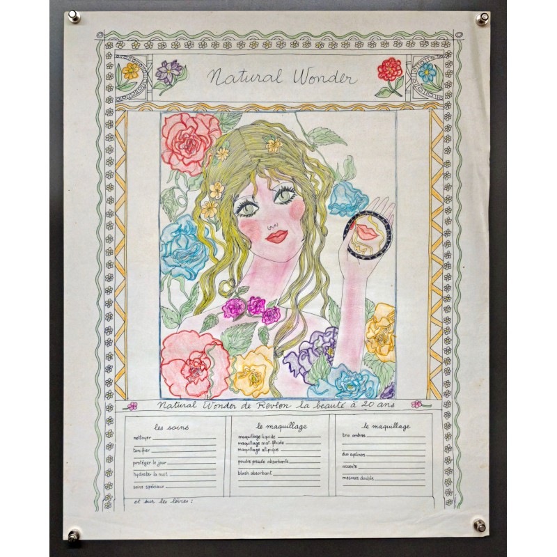 Au centre de l'affiche se trouve une illustration d'une jeune femme aux longs cheveux blonds, entourée de roses et de fleurs aux teintes pastel. Son regard captivant et ses lèvres finement maquillées mettent en valeur les produits de beauté de Revlon. L’utilisation de la typographie douce et cursive pour le titre « Natural Wonder » renforce le côté apaisant et féminin de l’ensemble. Les éléments graphiques tels que les petites fleurs et les motifs géométriques autour du cadre ajoutent une touche de romantisme et d’élégance à cette création artistique.