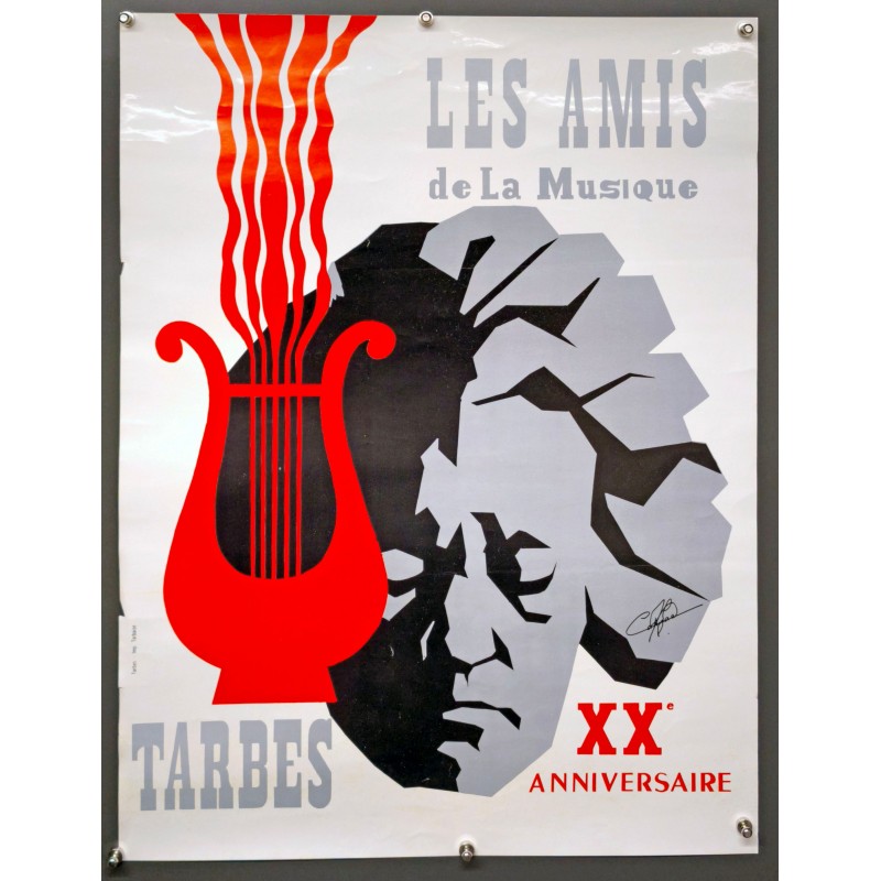 Cette affiche originale Les Amis de la Musique Tarbes XXe Anniversaire célèbre une occasion mémorable à Tarbes. Créée pour commémorer le 20e anniversaire de l'association dédiée à la musique, cette pièce captivante attire immédiatement l'œil avec son design graphique audacieux. Bien que l'auteur soit inconnu, l'imprimeur, l'Imprimerie Tarbaise, a contribué à la qualité de cette œuvre, qui démontre non seulement un sens artistique unique, mais aussi une grande attention aux détails.