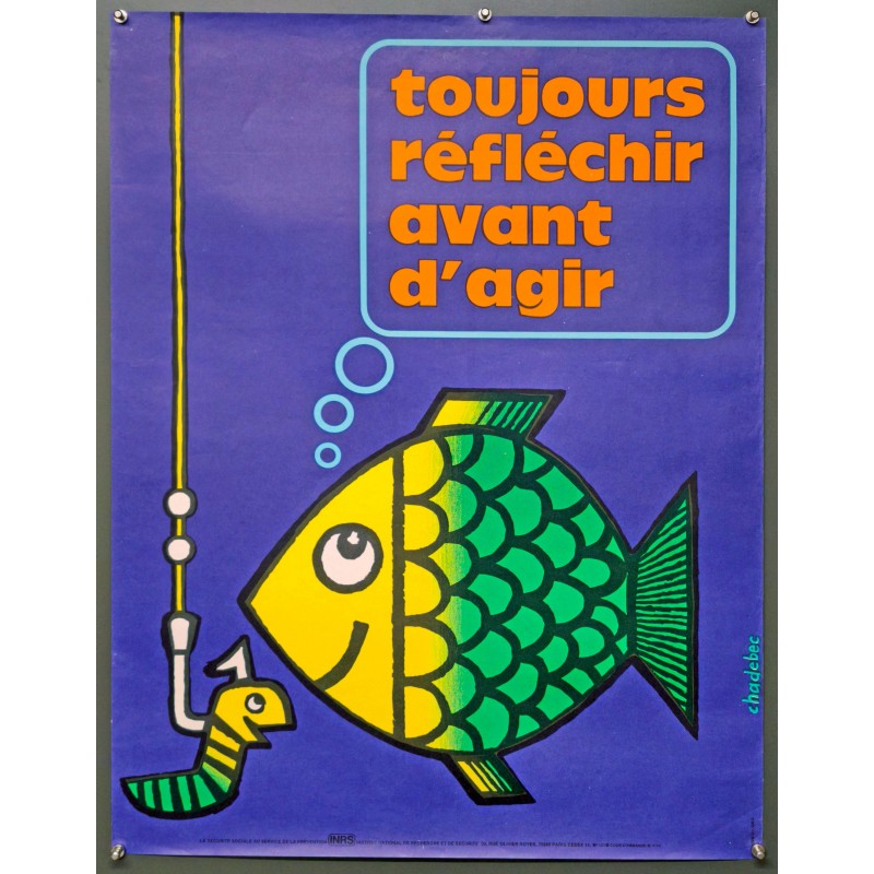 Au cœur de cette affiche, nous retrouvons un poisson coloré à l'expression joyeuse, juste au-dessus d'un appât suspendu. Le texte en gras, « toujours réfléchir avant d’agir », évoque un principe de précaution, renforçant le message de sécurité prôné par la Sécurité Sociale. Cette esthétique joue sur la simplicité et l'efficacité visuelle, rendant le message accessible à tous et facilement mémorisable.