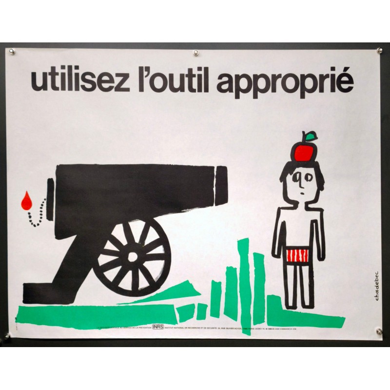 Cette affiche originale Utilisez l'Outil Approprié Sécurité Sociale au Service de la Prévention de Chadebec en 1976 est un excellent exemple de campagne d'information visuelle. Réalisée par l'imprimeur Illsa, elle vise à promouvoir l'importance d'utiliser les outils adéquats pour assurer une meilleure sécurité sociale et la prévention.