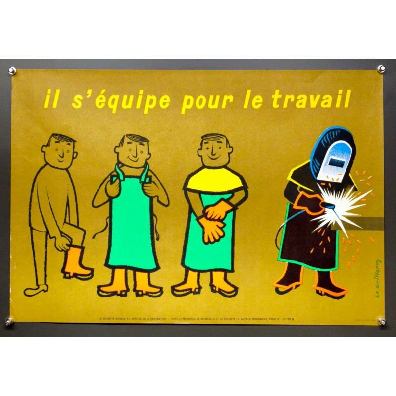 Cette affiche originale Il s'équipe pour le Travail Sécurité Sociale au Service de la Prévention de Le Guillerm en 1971 est un véritable témoignage visuel de l'importance de la sécurité au travail. Réalisée par l'imprimeur Illsa, cette œuvre s'inscrit dans la catégorie Société et se distingue par son objectif clair : promouvoir l'équipement de protection des travailleurs.