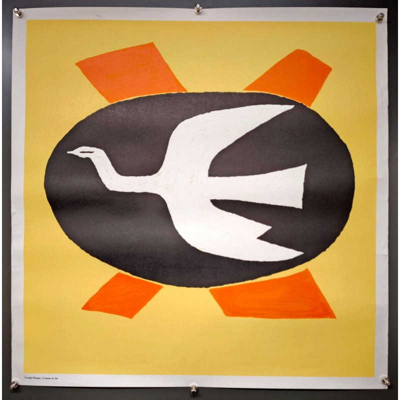 Visuellement, l'affiche est dominée par un fond jaune éclatant qui contraste magnifiquement avec un oval noir, mettant en avant un oiseau stylisé en blanc. Des formes géométriques orange ajoutent une dynamique supplémentaire, attirant le regard et communiquant une sensation de mouvement et d'énergie. La typographie ainsi que les éléments graphiques témoignent du style artistique caractéristique de Braque, qui est souvent associé au cubisme et à l’abstraction, cherchant à raconter des histoires à travers des formes simplifiées et des couleurs puissantes.
