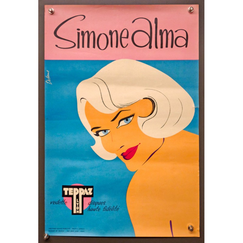 Cette affiche originale Disques Teppaz Simone Alma non entoilée de Delorme en 1960 est un véritable bijou du monde de la lithographie. Imprimée par l'Imprimerie Moderne du Lion, elle fait la promotion des disques Teppaz, marquants de l'époque, qui alliaient qualité sonore et esthétisme. Au cœur de cette pièce artistique se trouve le visage séduisant de Simone Alma, représenté dans un style graphique audacieux qui attire instantanément le regard.