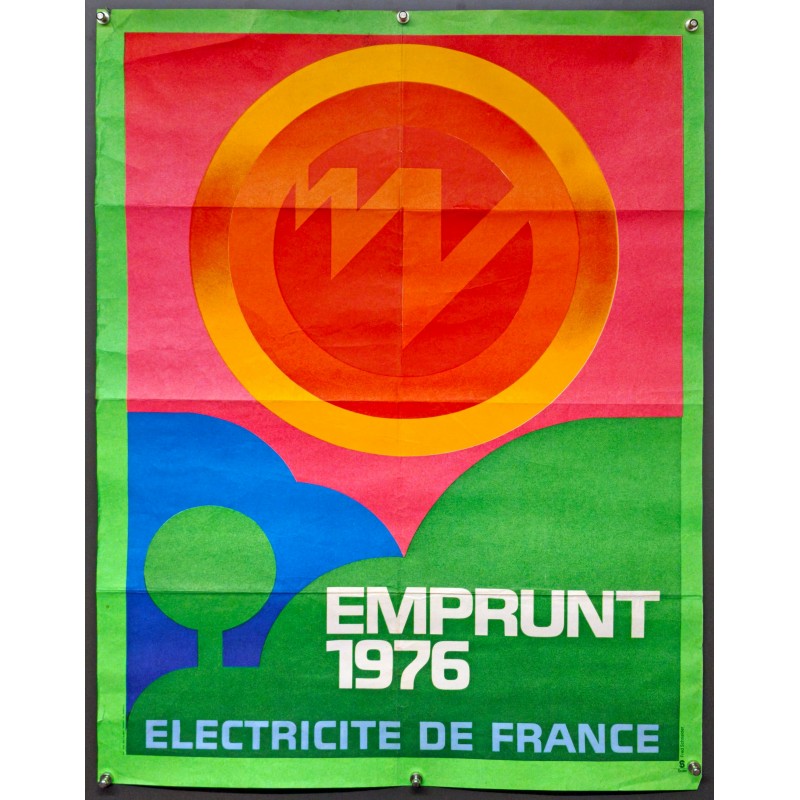 Évoquant l'univers de l'électricité, cette affiche fait la promotion de l'Électricité de France à travers un design graphique mettant en avant le mot "EMPRUNT" suivi de l'année 1976. Les couleurs dominantes, un mélange harmonieux de vert, de bleu, de rouge et d'orange, créent une atmosphère dynamique et engageante, soulignant l'importance et le progrès de l'énergie électrique à cette époque. Le logo stylisé évoque les valeurs de modernité et d'innovation.