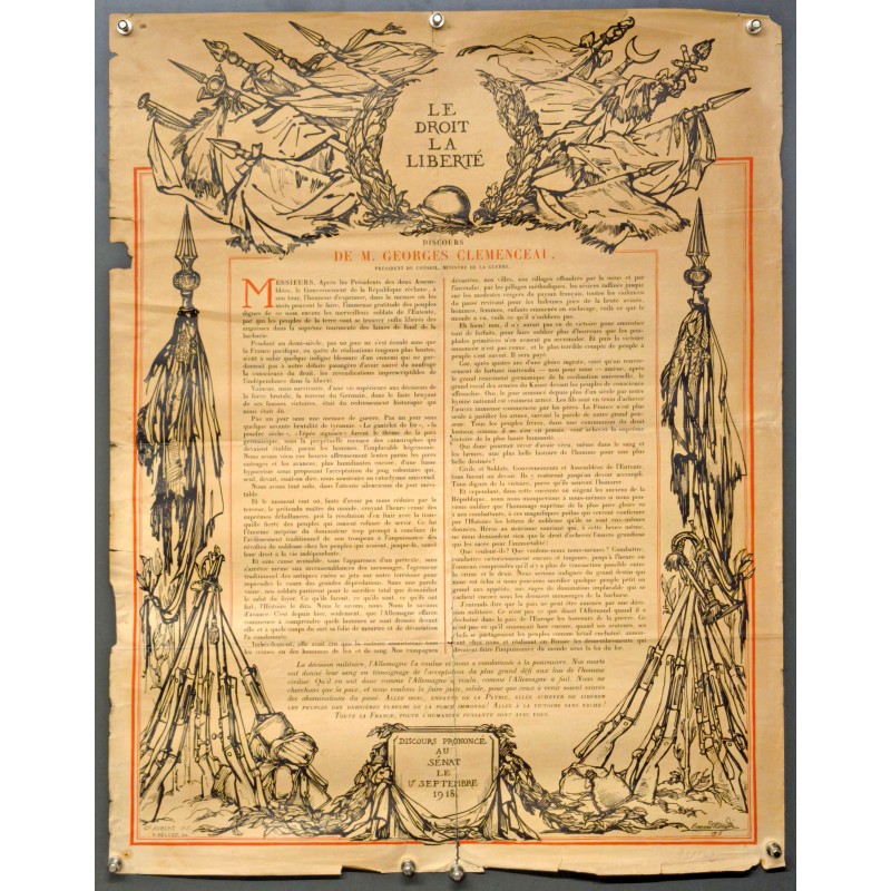 Située dans un contexte historique tumultueux, cette affiche a été élaborée à une époque où la France faisait face aux défis de la Première Guerre mondiale. Clémenceau, connu pour son rôle déterminant en tant que président du Conseil, était un ardent défenseur des droits et de la liberté, et son discours visait à galvaniser le peuple français autour de valeurs essentielles.