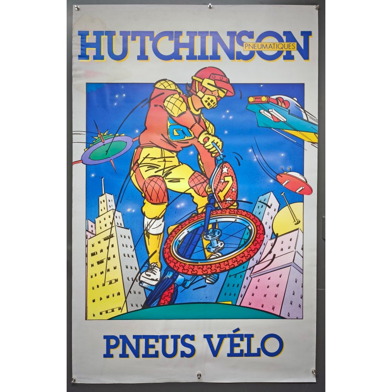 Au cœur de cette composition, on découvre un personnage stylisé sur son vélo BMX, défiant la gravité dans une scène spatiale. Les éléments visuels incluent des bâtiments iconiques, une palette vibrante de couleurs et des éléments graphiques qui évoquent le mouvement et l'énergie. La typographie est audacieuse, avec le mot « HUTCHINSON » en lettres capitales, renforçant l'impact visuel de la marque, tandis que « PNEUS VÉLO » se distingue en bas de l'affiche.
