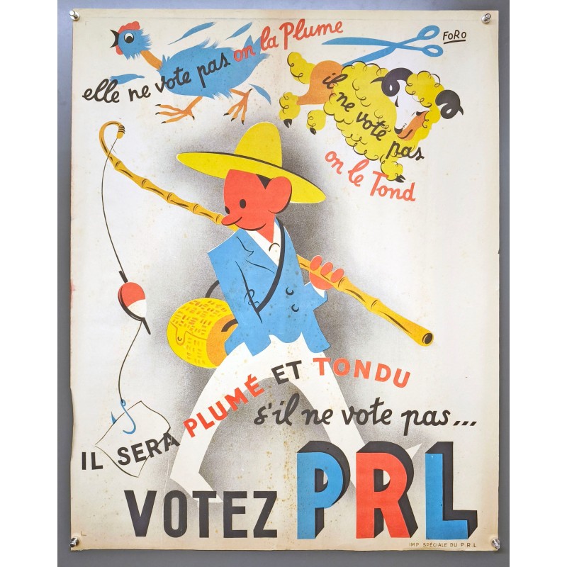 Ne laissez pas passer l'opportunité d'ajouter cet artefact historique à votre collection. Faites le premier pas vers l'acquisition de cette affiche originale Votez PRL Il sera plumé et tondu s'il ne vote pas PRL de Foro.