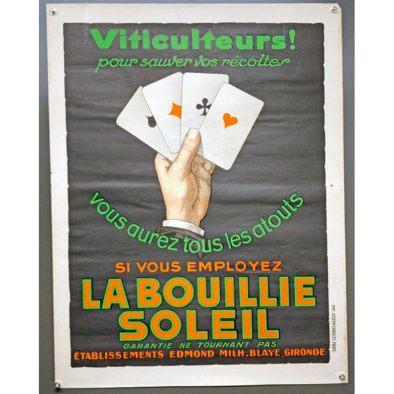 Cette affiche originale La Bouillie Soleil Viticulteurs pour Sauvez vos Récoltes est une œuvre captivante qui fait la promotion d'un produit essentiel pour les viticulteurs. Imprimée par Joseph Charles, cette lithographie invite à découvrir les avantages de la Bouillie Soleil, un traitement faisant partie intégrante de l'arsenal des viticulteurs pour protéger et sauver leurs récoltes. Sa conception artistique et son message percutant sont des éléments clés qui en font une pièce de collection recherchée.
