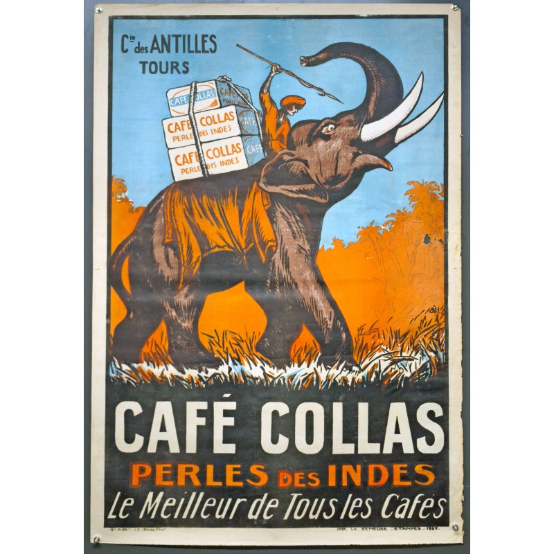 L'affiche promove le célèbre Café Collas, une marque qui promet d'apporter le meilleur café grâce à son origine prestigieuse. On peut y voir un éléphant majestueux, emblème de force et d'exotisme, transportant des caisses de café. Cette représentation audacieuse et colorée fait écho à l’aventure et à la découverte, deux notions intimement liées à l'univers du café. L'éléphant, symbole de la puissance et de la noblesse, se dresse fièrement devant un paysage tropical vibrant et stylisé dans des teintes orange et bleue.