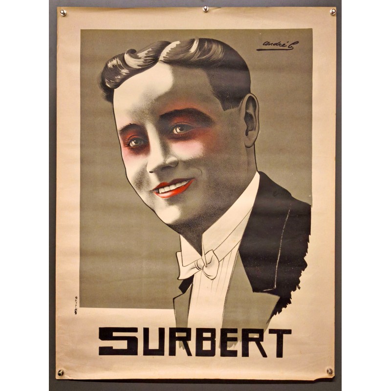 Dans cette lithographie, on peut observer une typographie audacieuse en lettres capitales qui épèle le mot "SURBERT", ancrant ainsi le nom dans l'esprit du spectateur. Cette présentation graphique témoigne d'une époque où l'art de la communication visuelle cherchait déjà à séduire et à captiver le public. Cette esthétique, tout en nuances de gris, avec des touches de rouge pour les lèvres, permet d'accentuer le sourire du chanteur, ajoutant une dimension chaleureuse et accueillante à l'affiche.