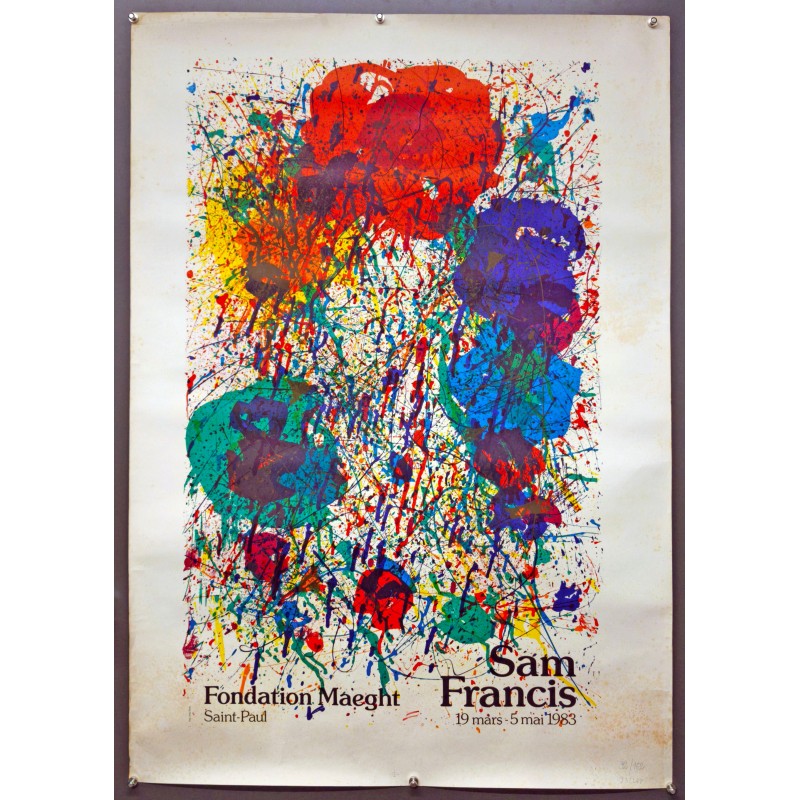 Visuellement, l'affiche se distingue par sa composition audacieuse. Des touches expressives de couleur, allant du rouge flamboyant au bleu profond, en passant par des teintes vertes et jaunes éclatantes, se mêlent dans un tourbillon créatif. La typographie, quant à elle, est à la fois élégante et contemporaine, affirmant le nom de l'artiste, Sam Francis, et le lieu de l'exposition, la Fondation Maeght, de manière frappante.