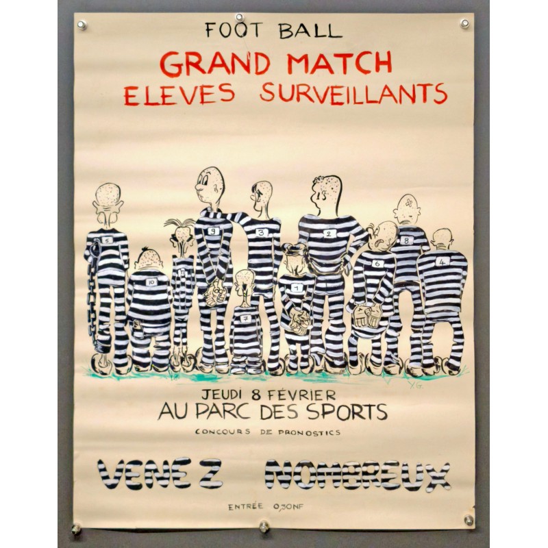 Pour conclure, découvrez l'affiche originale Football Grand Match Eleves Surveillants Au Parc des Sports de YG qui saura ajouter une touche vibrante à toute collection ou décoration murale. Ne manquez pas cette opportunité de posséder une pièce d'histoire et d'art unique, qui combine sport, divertissement et un style graphique inimitable.