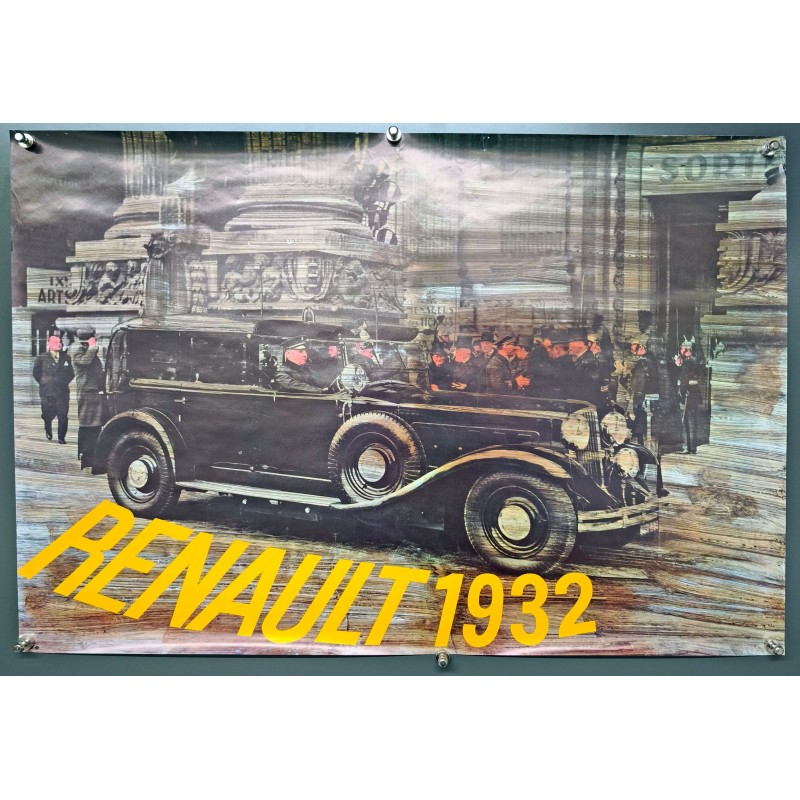 Historiquement, cette affiche a été créée à une époque où l'automobile devenait un symbole de réussite et de liberté. La Renault 1932, dont l'image est mise en avant, illustre parfaitement cette tendance, représentant non seulement un mode de transport, mais aussi un statut social. La voiture noire, à la fois majestueuse et imposante, évoque une époque glamour et un style de vie aspirational.