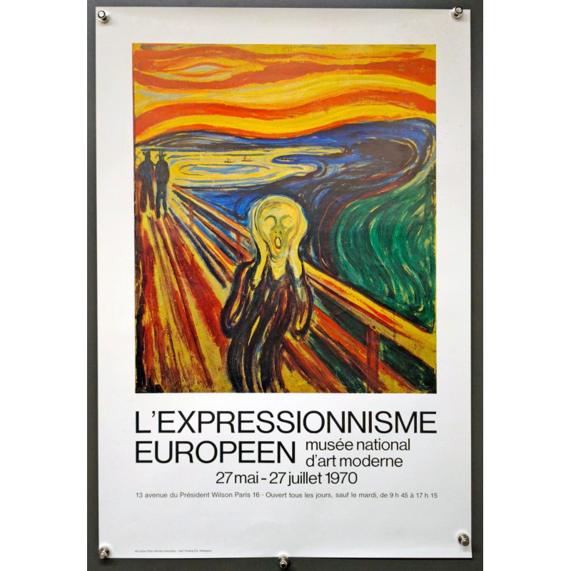 Les éléments visuels clés de cette affiche comprennent une représentation saisissante de l'émotion et du désespoir, incarnée par une figure emblématique. Le style artistique, caractéristique de l'expressionnisme, utilise des formes stylisées et des couleurs vibrantes pour évoquer des sentiments intenses. La typographie est audacieuse et moderne, inscrite en lettres capitales pour attirer l'œil et communiquer clairement les informations de l'exposition.