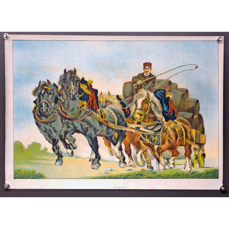 Cette affiche originale Attelage au Galop Transport Tonneaux Vin LM est un témoignage fascinant de l'art de la lithographie publicitaire. Bien qu'elle soit signée par un auteur inconnu, son attrait visuel et son thème historique en font un objet de collection précieux. Les dimensions de cette œuvre sont de 48 x 34 cm, idéale pour être exposée dans une collection ou un espace de décoration.