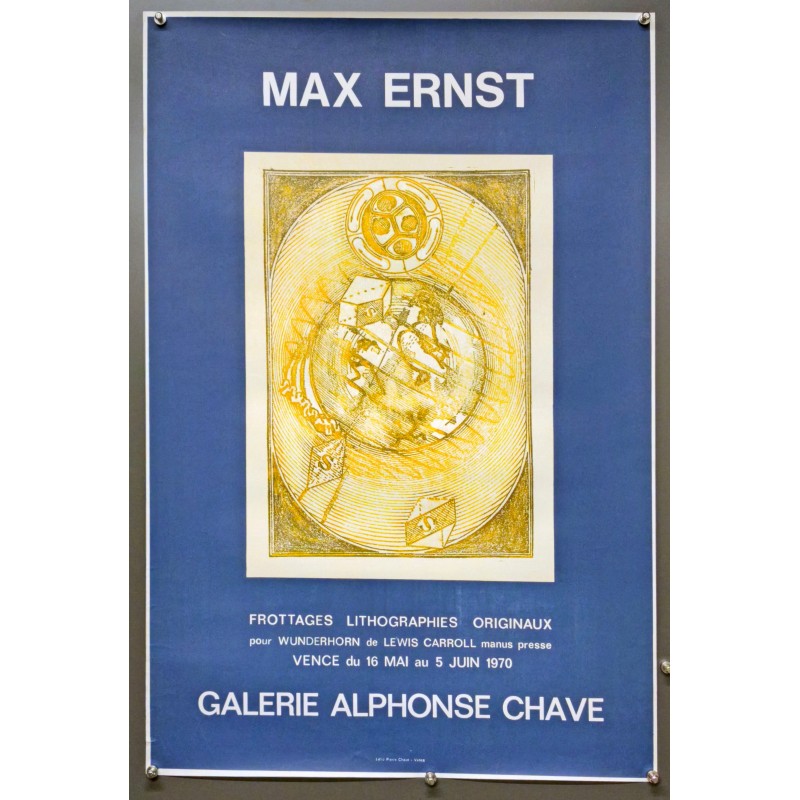 Cette affiche célèbre une exposition à la Galerie Alphonse Chave à Vence, présentant des frottages et lithographies provenant du chef-d'œuvre Wunderhorn de Lewis Carroll. D'une dimension de 52x77 cm, l'œuvre se démarque par sa composition intrigante, qui invite à une exploration visuelle. Les éléments graphiques qui composent l'affiche oscillent entre abstraction et figurativité, entraînant le spectateur dans un monde onirique, typique du style de Max Ernst.