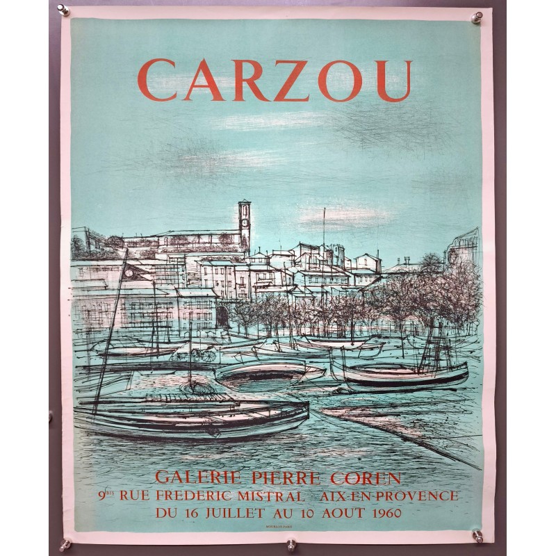 L'affiche fait la promotion d'un événement culturel, présentant la Galerie Pierre Coren, située au 9BIS Rue Frédéric Mistral, à Aix-en-Provence, du 16 juillet au 10 août 1960. Les éléments visuels sont dominés par une vue séduisante de la riviera avec des bateaux amarrés, suggérant une atmosphère tranquille et estivale, emblématique du sud de la France. Le magistral travail de Carzou, caractérisé par des lignes épurées et une perspective délicate, attire immédiatement le regard.