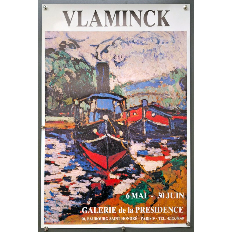 Les éléments visuels clés de cette œuvre incluent des bateaux de différentes teintes, avec un accent sur des nuances de bleu et de rouge, qui se marient harmonieusement avec des touches de vert et de beige. L’utilisation des coups de pinceau caractéristiques de Vlaminck, confère une profondeur et une texture qui transmettent une sensation de mouvement sur l'eau. La typographie, simple mais efficace, souligne le nom de l’artiste, Vlaminck, ajoutant une note d’autorité et de prestige à l’affiche.