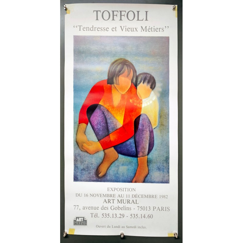 Cette affiche originale Toffoli Tendresse Vieux Métier Art Mural 1982 de Toffoli en 1982 est une pièce subtile qui évoque une exposition unique dédiée à l'art et aux vieux métiers. Imprimée par Renolleau, elle reflète parfaitement l'esthétique de son époque tout en mettant en lumière le savoir-faire artisanal. L'événement s'est déroulé dans le cadre de l'accueillante galerie Art Mural, située au 77, avenue des Gobelins à Paris.