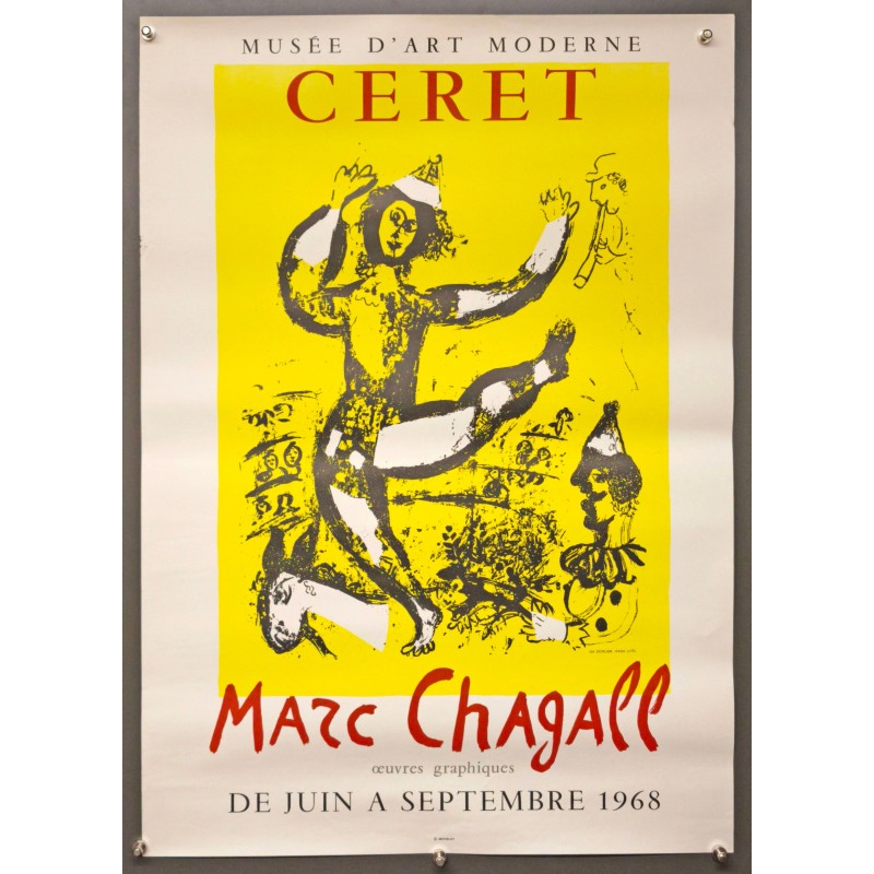 Au cœur de cette affiche se trouvent des personnages vibrants, dont un homme dansant mettant en valeur des formes stylisées et expressives, typiques du style de Chagall. La typographie utilisée est dynamique et enjouée, accentuant le titre et l'annonce de l'exposition de façon frappante sur un fond jaune vif. Ce choix de couleur non seulement attire immédiatement l'œil, mais évoque également la joie et la créativité qui caractérisent l'œuvre de Chagall.