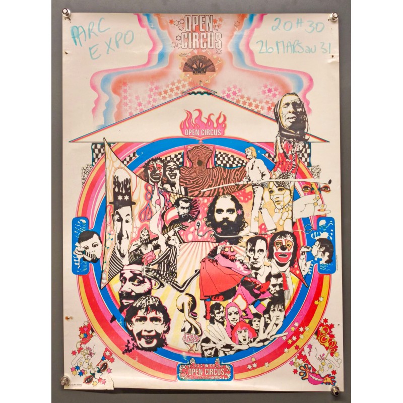 Cette affiche célèbre l'Open Circus, un événement majeur qui plonge le public dans un univers de créativité, d'acrobaties et de performances artistiques. Les éléments visuels sont richement garnis de personnages fascinants représentant des artistes de cirque, des clowns, et divers symboles d'émerveillement. Le titre, "Open Circus", se distingue en grands caractères, éclatant en haut de l'affiche, attirant immanquablement l'attention.