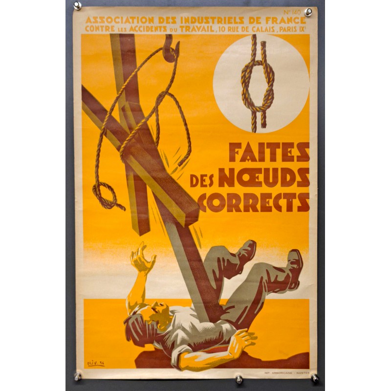 Cette affiche originale Faites des Noeuds Corrects de Olivier en 1936 est un exemple saisissant de l'art graphique engagé. Réalisée par l'imprimerie Armoricaine, cette lithographie met en avant l'importance de la sécurité dans le milieu industriel. L'affiche appelle à la prudence en promouvant la bonne pratique de l'utilisation des nœuds, une compétence essentielle pour éviter les accidents du travail.