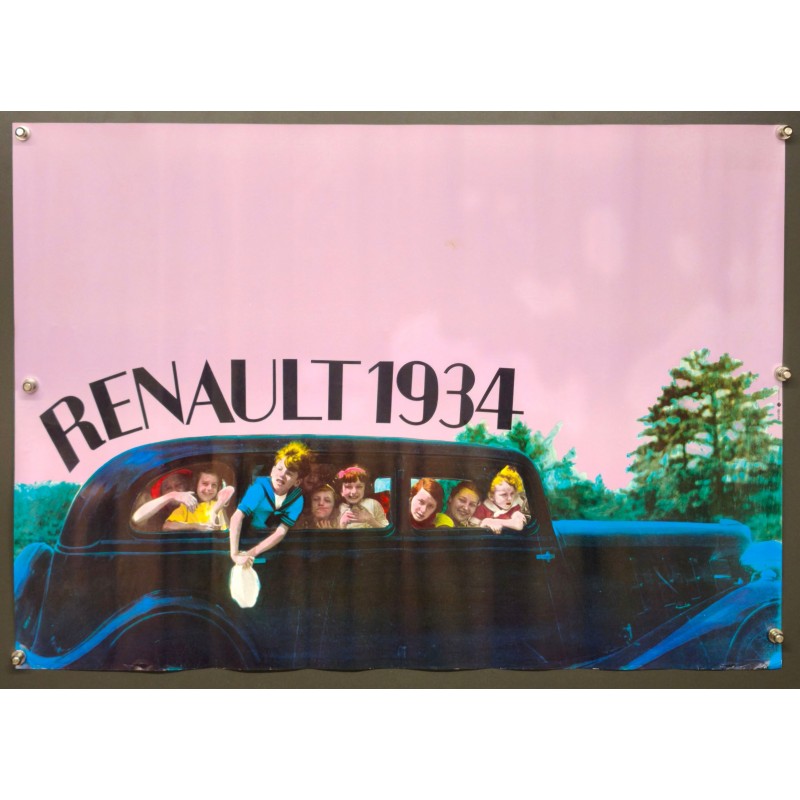 L'illustration met en scène plusieurs enfants souriants, accoudés à la fenêtre d'une voiture classique. Cette image évoque des souvenirs de road trips familiaux, incarnant l'idée d'évasion et de liberté. L'utilisation de la voiture comme élément central renforce l'idée que celle-ci est bien plus qu'un simple moyen de transport ; elle symbolise l'aventure et l'amusement. La typographie massive "RENAULT 1934" en haut de l'affiche attire immédiatement l'attention, faisant de ce message un élément clé de la promotion.