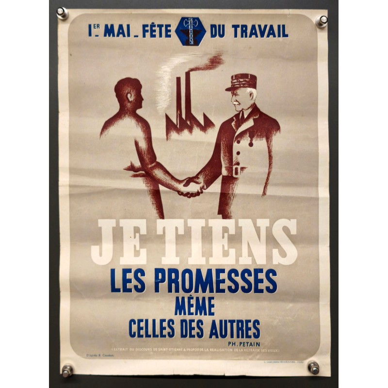 N'attendez plus pour ajouter cette pièce emblématique à votre collection ! Chaque détail de cette affiche originales Pétain Je Tiens les Promesses Même Celles des Autres Fete du Travail est chargé de symbolisme et d'histoire. Procurez-vous-la dès maintenant et faites-en le centre d'attraction de votre espace !