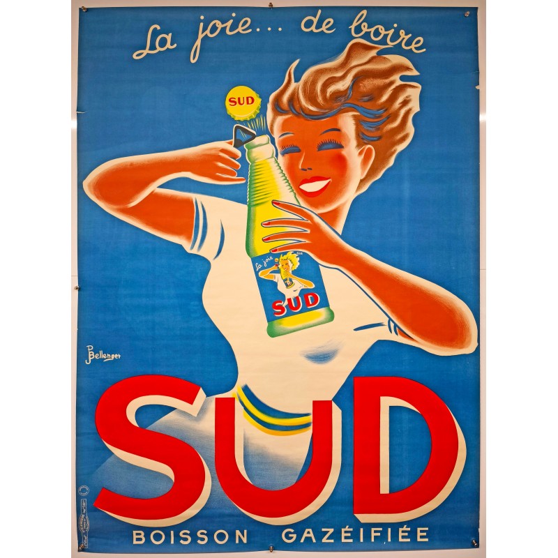 Ajoutez cette pièce unique à votre collection ! Ne manquez pas l'occasion de posséder un fragment de l'histoire de la publicité française avec cette affiche originale La Joie de Boire Sud Boisson Gazéifiée de P Bellenger. Un véritable atout pour tout amoureux de l'art graphique et des belles choses.