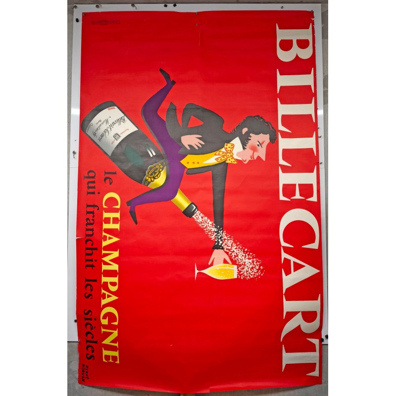 Au centre de l'affiche, un personnage élégant est représenté, mettant en avant une bouteille de champagne Billecart. La figure, arborant un costume noir et un nœud papillon, joue un rôle essentiel dans la promotion de cette marque emblématique. Les détails sont soigneusement exécutés, et le style graphique, typique des années passées, évoque le dynamisme et l'esprit festif associé à la consommation de champagne. Le texte "le CHAMPAGNE qui franchit les siècles" est clairement visible, soulignant la tradition et la longévité de cette prestigieuse maison.